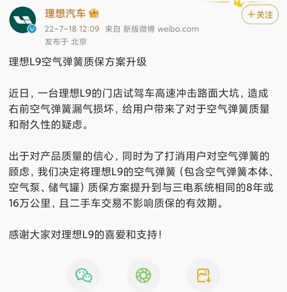 7月18日12时09分,理想汽车官方微博发布“理想L9空气弹簧质保方案升级”,将理想L9的空气弹簧(包含空气弹簧本体、空气泵、储气罐)质保方案提升到与三电系统相同的8年或16万公里。